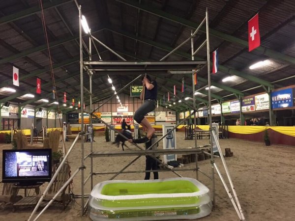 Zaterdagavond werd als afsluiting van het grote Indoor de Derby van Genemuiden verreden. Het betrof hier een parcours over 2 binnenmaneges. De cross hindernissen uit Vollenhove sierden de beide maneges waar het parcours met in totaal 17 hindernissen uit bestond. De combinaties moesten eerst in de ene bak een parcours afleggen en door een smalle doorgang naar de andere bak " crossen" waar het parcours verder ging. Na afloop van dit gedeelte moest de combinatie weer terug door het poortje naar de grote binnenmanege om het parcours te voltooien. Bij aanvang van het parcours moest Jasper in een bezemsteel gaan hangen boven een zwembad. Zodra hij de stok los liet begon de tijd van Marieke haar parcours te lopen. Helaas zaten ze niet bij de prijzen maar we hebben wel een leuke dag en avond gehad.